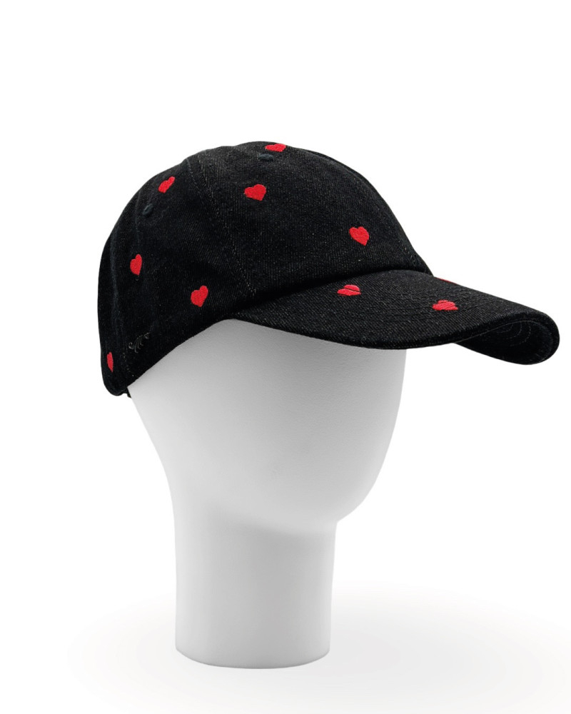 Black washed cotton denim cap with small embroidered red hearts. Black stainless steel logo. Adjustable size at the back.
