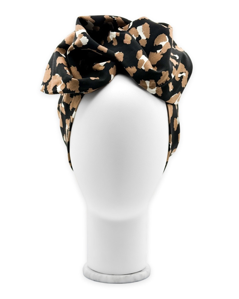 Viscose printed with leopard patterns in shades of camel and black. It will add a wild and bold look to your style. This turban covers your head completely, you can move with complete peace of mind, it will not move! It can be put on like a hat thanks to its elastic head and its aluminum wire at the end.