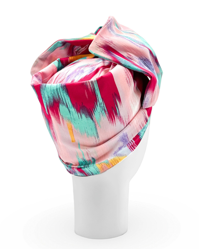 Cotton satin on a pink background with turquoise blue, red and yellow patterns.. This head jewel is magical! it suits all your outfits, all colors!