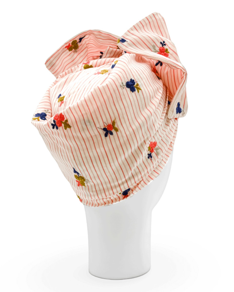 Lightweight cream and pink striped fabric with delicate embroidered multi-colored flowers.