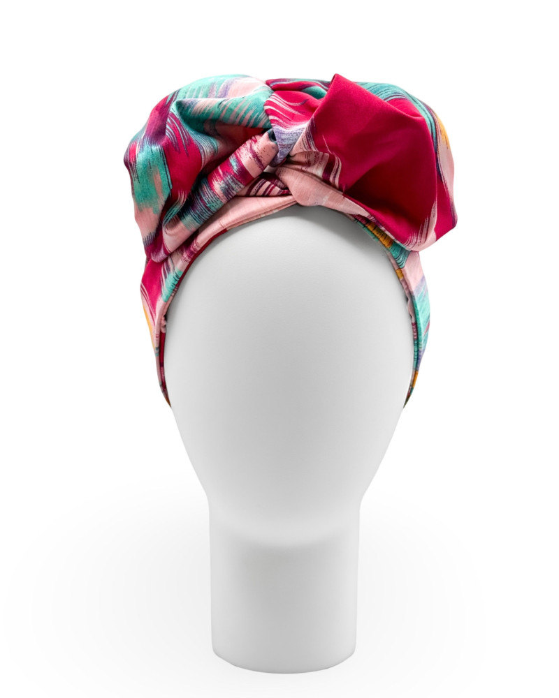 Cotton satin on a pink background with turquoise blue, red and yellow patterns.