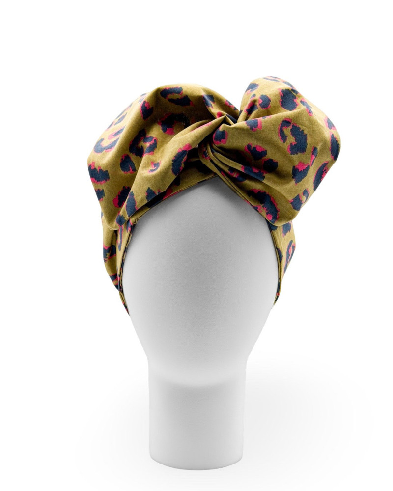 The timeless and bold leopard print will add a wild, sophisticated, and warm touch to your look. Khaki fabric with black and raspberry patterns.