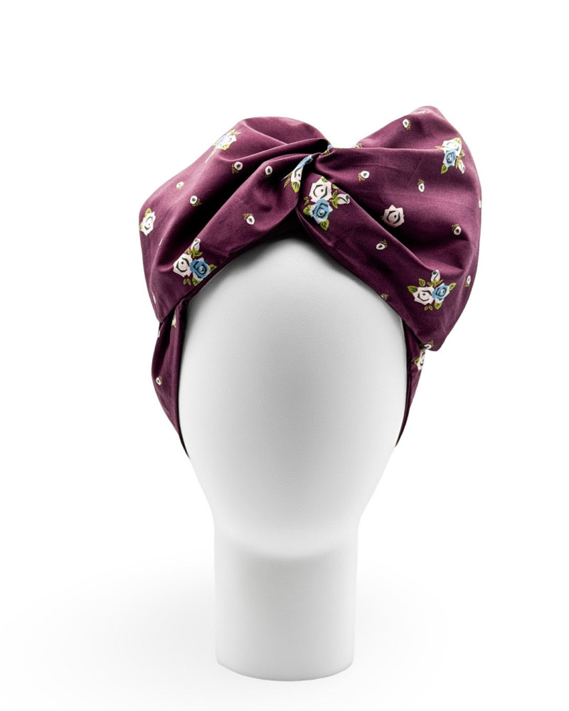 Beautiful wine-colored fabric with small blue, beige and green flowers.