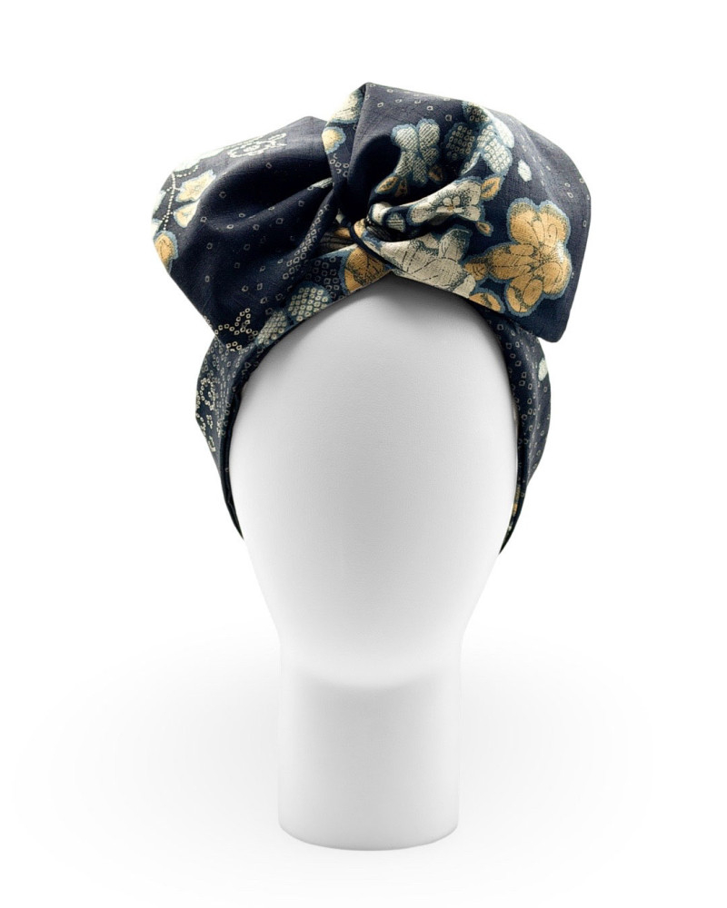 Navy blue dobby Japanese fabric with beige flowers and a gradient of blue