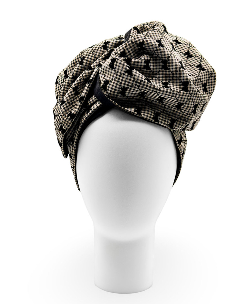 Beautiful beige, black and grey fabric with small black velvet bows.