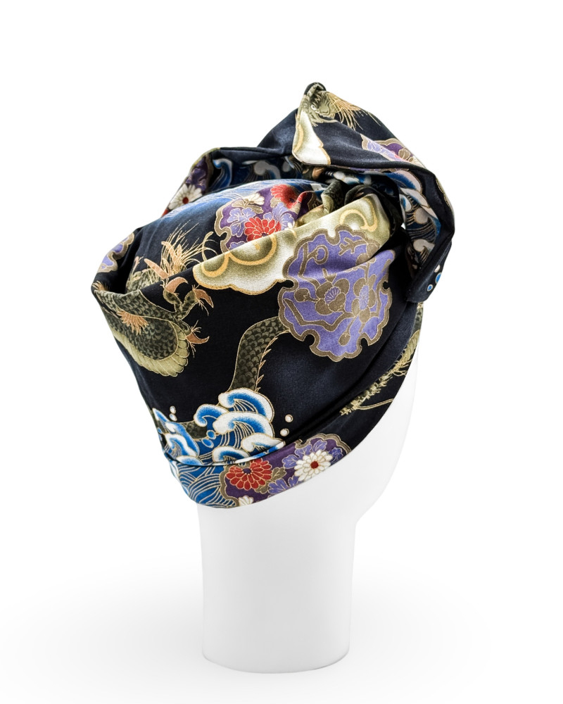 Magnifique tissu Japonais imprimé de dragons dorés , vagues et fleurs en forme Yukiwa (flocon de neige), sur fond de couleur noir. Tissu confortable. Très belle qualité d’impression. Ce turban couvre entièrement votre tête, vous pouvez bouger en toute sérénité, il ne bougera pas !